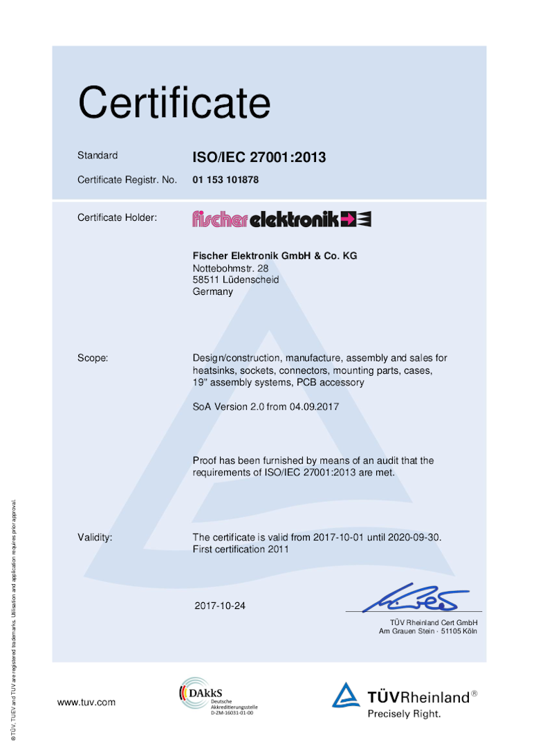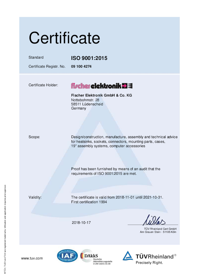 Все производство Fischer Elektronik отвечает высоким стандартам ISO 9001 и ISO 14001. Из всей программы выпускаемой продукции Fischer Elektronik исключены материалы, наносящие вред окружающей среде.