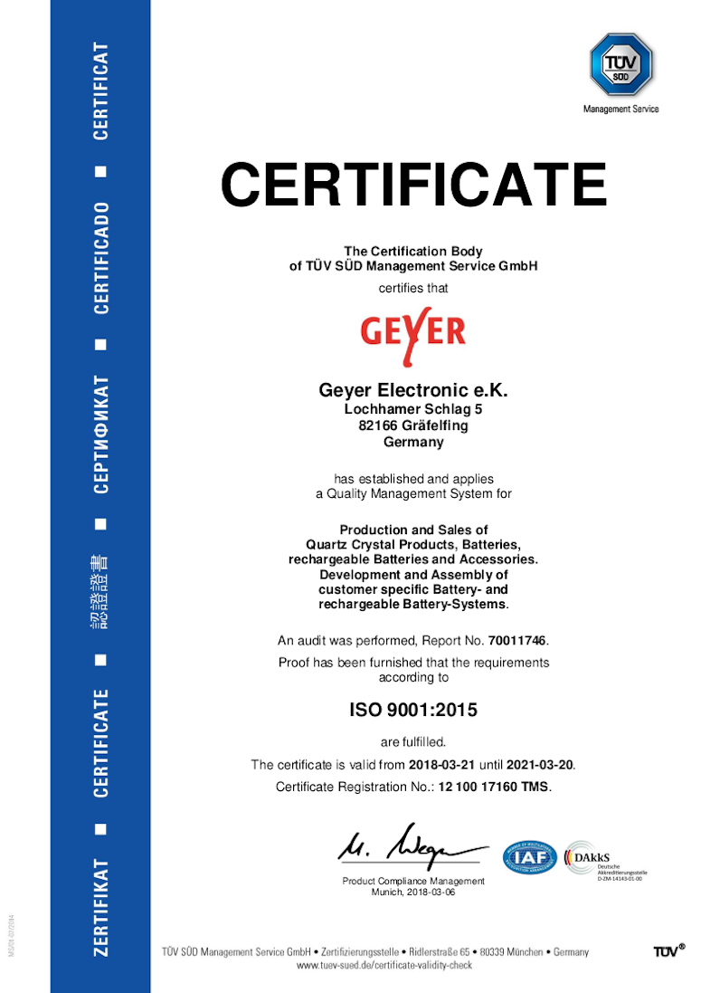 Немецкая компания Geyer Electronic была основана в 1964 году. Она производит кварцевые и керамические резонаторы и кварцевые генераторы с популярными рабочими частотами в широко распространенных выводных корпусах и корпусах для поверхностного монтажа. Изделия предназначены для аппаратуры связи, автоэлектроники, мультимедиа, промышленной и бытовой электронной аппаратуры. Тесная кооперация с заказчиками на всех этапах — от разработки изделия до серийного производства — обеспечивает устойчивость компании.