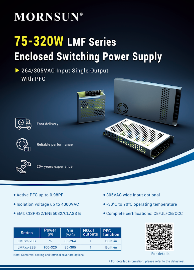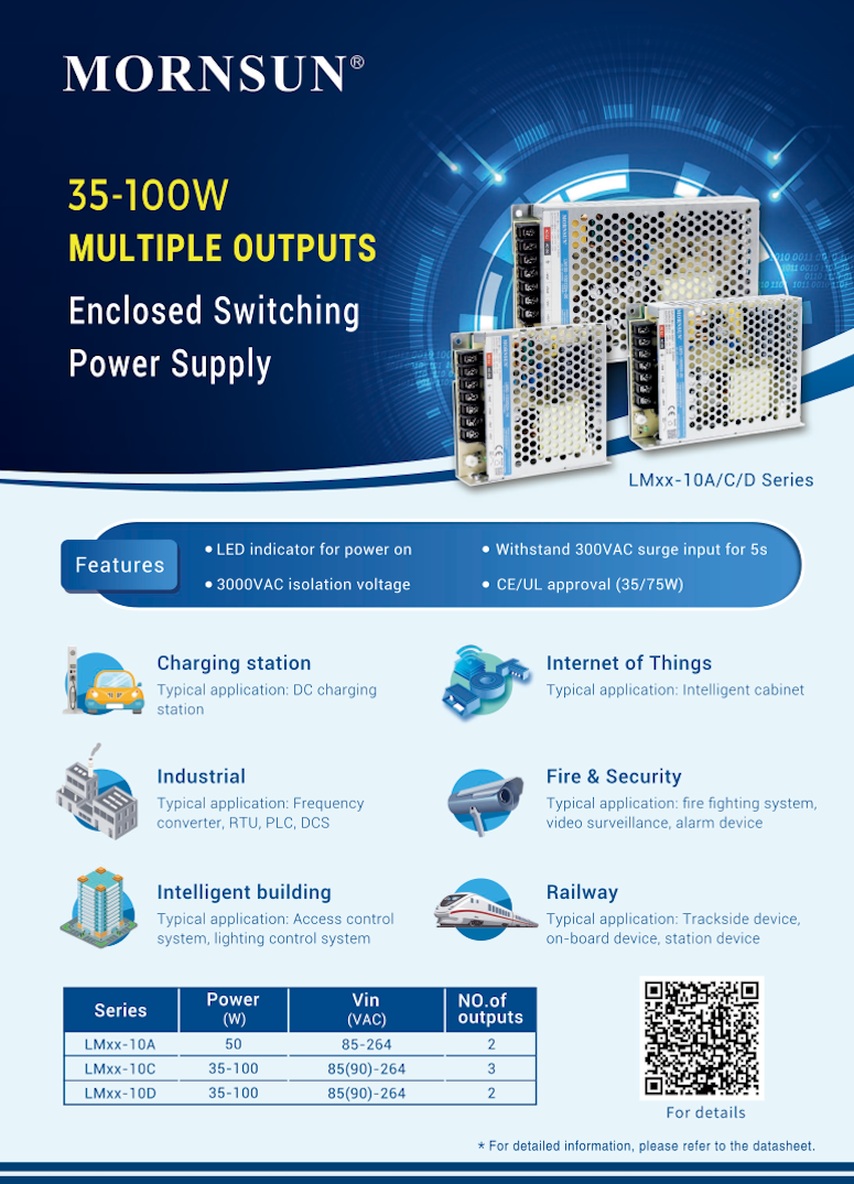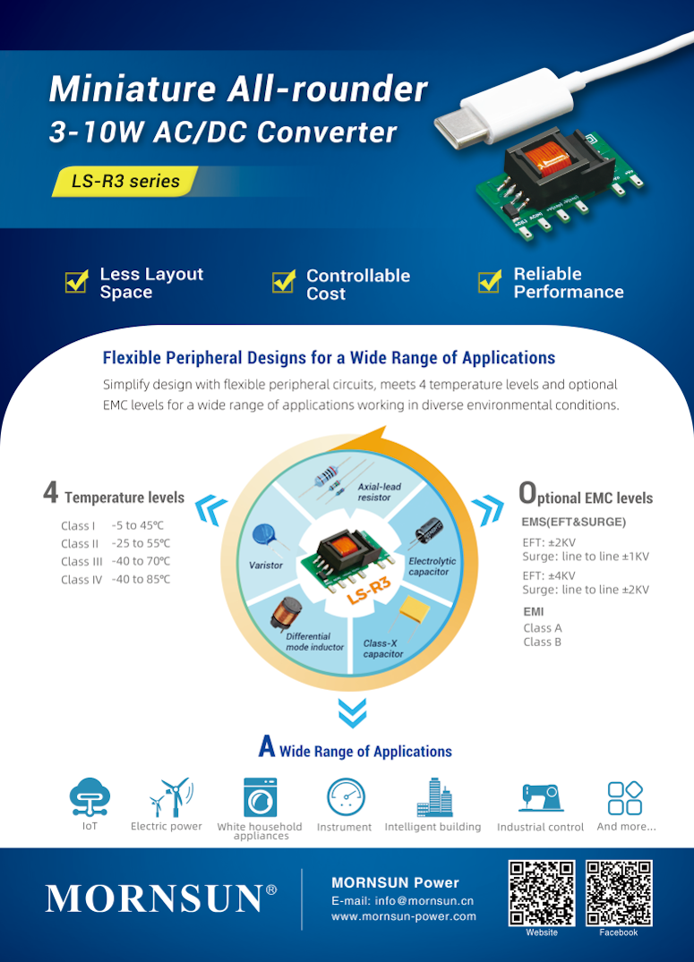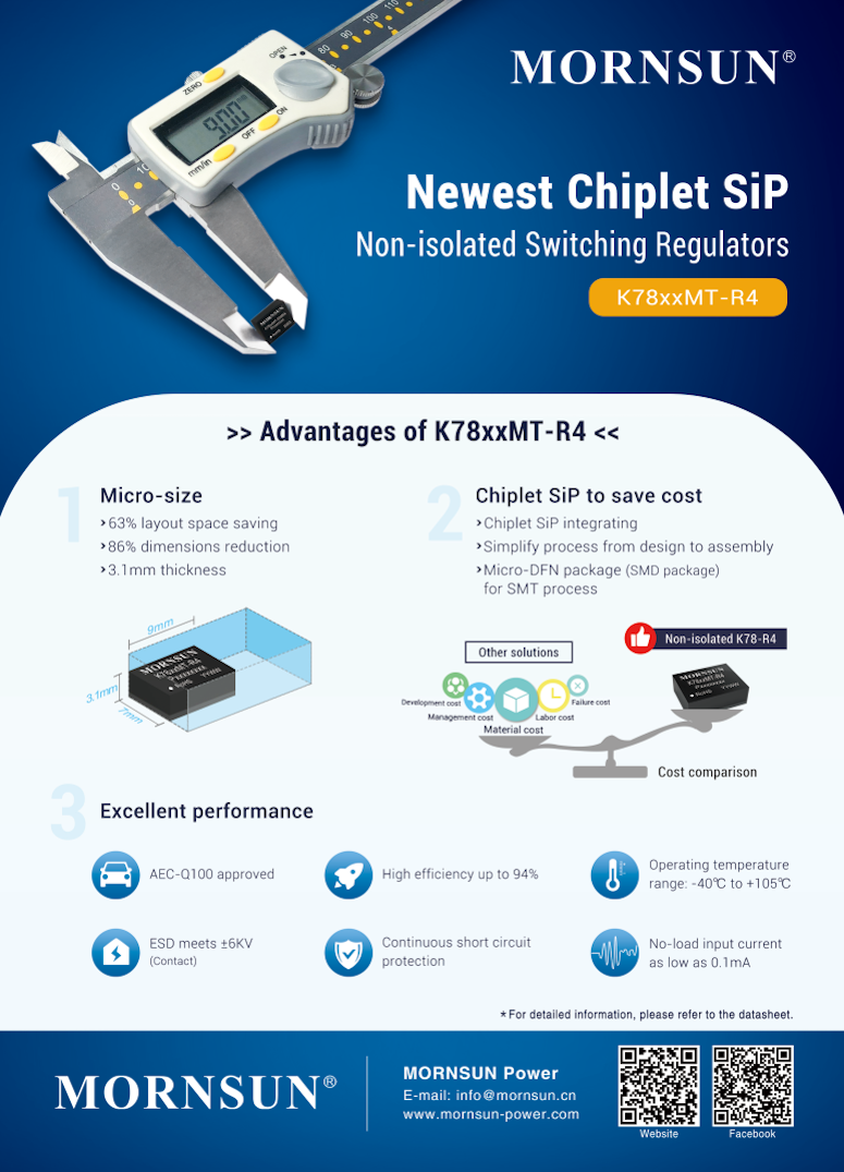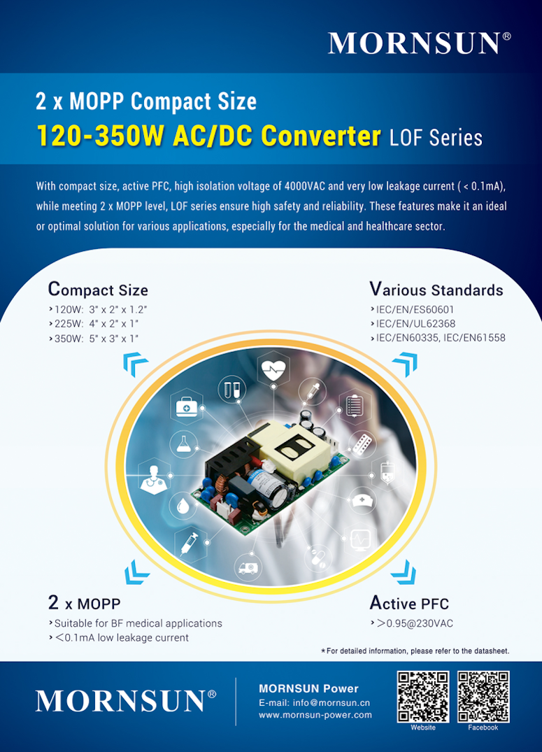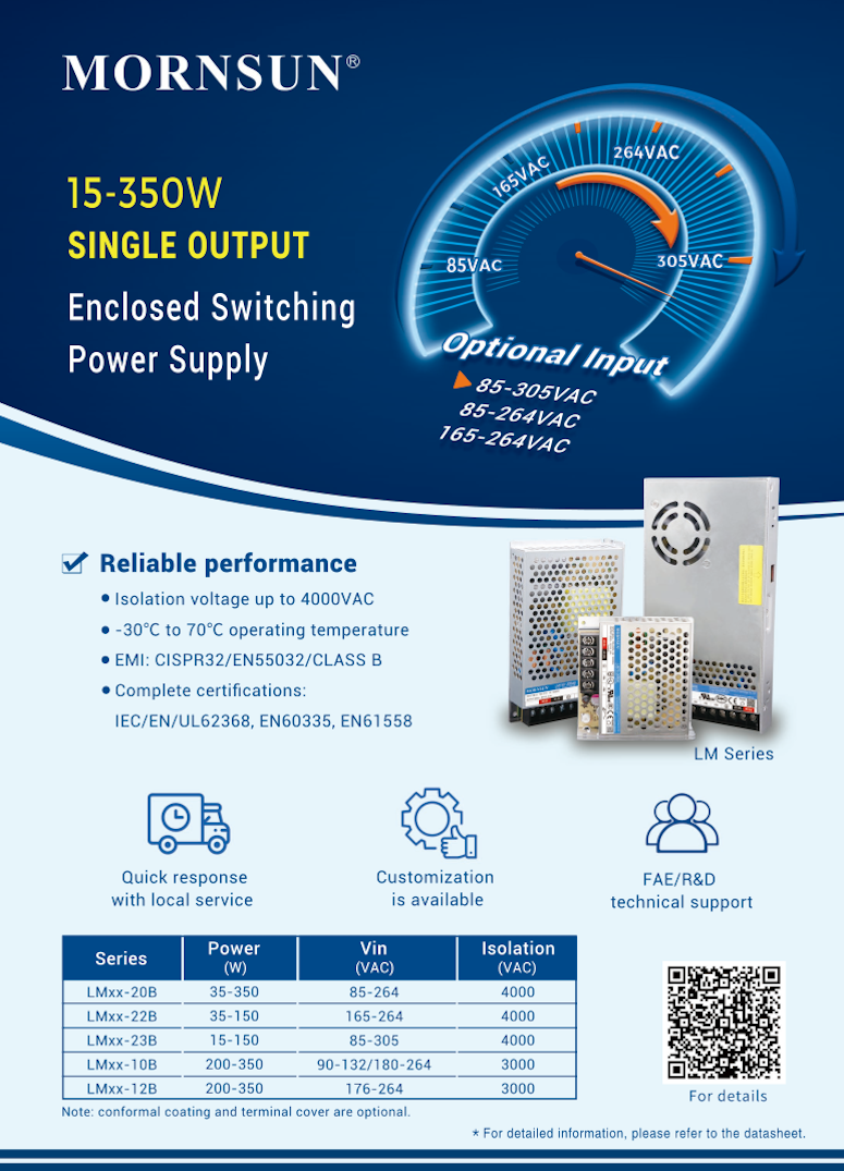 Mornsun – высокотехнологичная компания, основанная в 1998 году в Китае. В настоящий момент является одним из национальных лидеров на рынке источников питания. Основным видом продукции являются DC/DC и AC/DC преобразователи, устанавливаемые на печатную плату. Кроме того, компания выпускает сетевые адаптеры, драйверы IGBT, устанавливаемые на плату фильтры ЭМП, изолирующие усилители и оригинальные микросхемы собственной разработки для изготовления импульсных AC/DC и DC/DC преобразователей. Выпускаемая продукция имеет необходимые сертификаты UL, CE, CSA, CB и DoE Level VI.