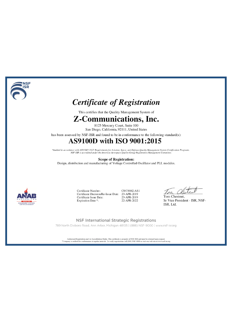 Z-Communications, имеет сертификат AS9100D с сертификатом ISO 9001:2015 и является членом International Aerospace Quality Group.